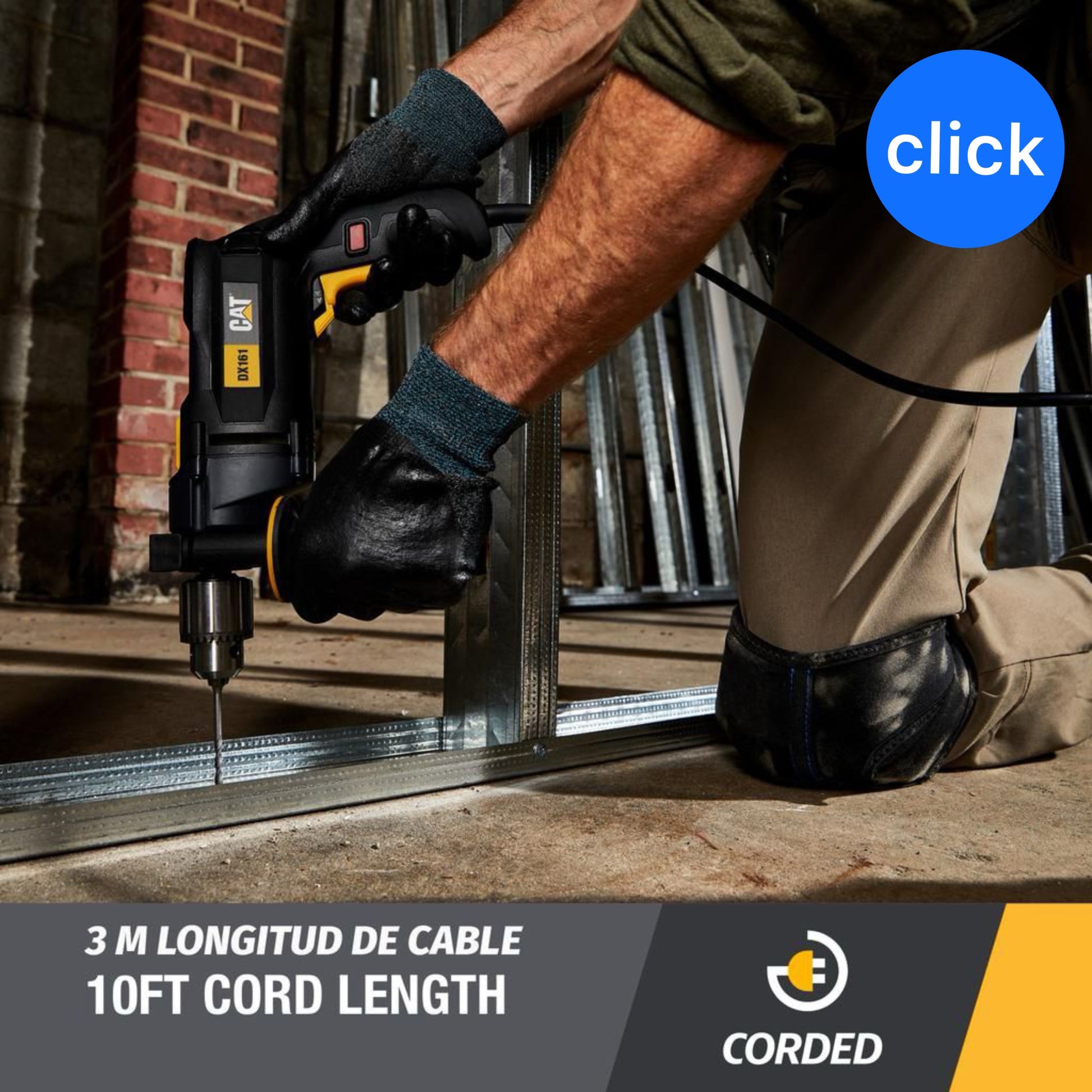 Potencia y precisión, el taladro percutor eléctrico CAT es ideal para perforar hormigón, madera o metal en instalaciones eléctricas, montaje de estructuras y fijación de anclajes. Cuenta con motor de 8.5 A el cual alcanza 3 000 RPM y 48 000 BPM. Su porta brocas metálico asegura un ajuste firme y su caja de aluminio ligero garantiza la durabilidad para trabajos pesados. Diseñado para maximizar la comodidad, la empuñadura de goma sobre moldeada y su cable que permiten tener libertad de movimiento. Perfecto para obras de construcción, remodelaciones y mantenimiento profesional.